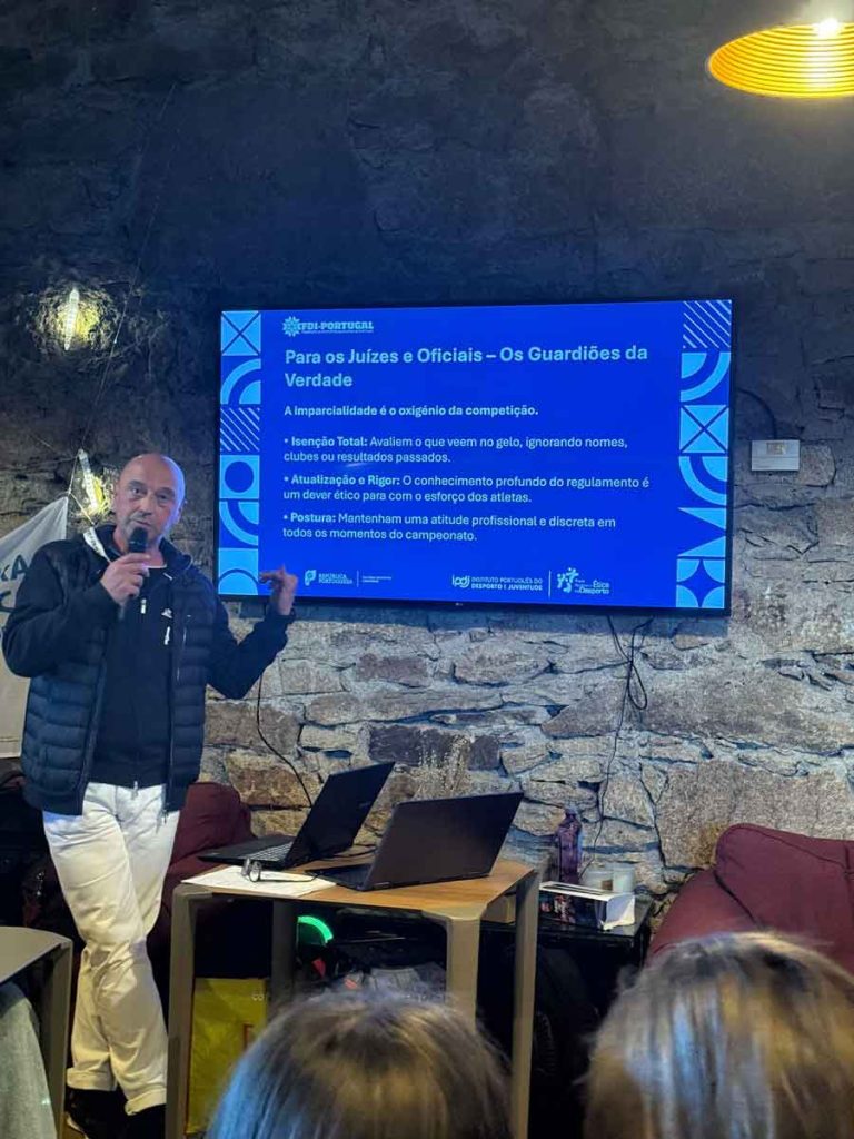 A sessão, que serviu para uma apresentação que serviu de “Guia de Conduta para o Campeonato de Patinagem Artística 2026”, foi dinamizada por João Fidalgo, Embaixador da Ética da FDI-Portugal. Com uma plateia repleta, o workshop focou-se na ideia de que a performance técnica e a beleza artística devem ser sempre acompanhadas por uma postura moral irrepreensível.